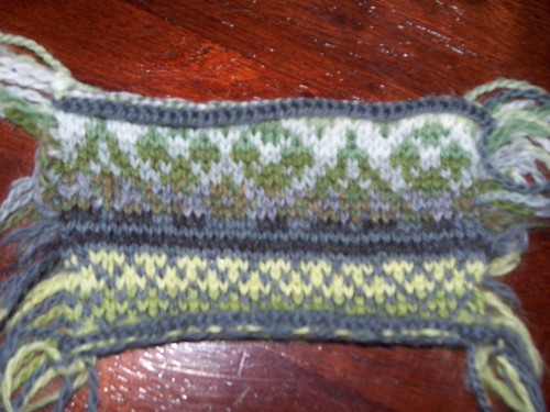I tried out two different color combos for the check section. I’ve decided that while the yellows are pretty, I think they’re too bright for the overall sweater – the greens in the medallion are muted and the yellows seem to scream at me a bit too much. So I’m going with the colors up top for the check section. And notice how the bottom (and top) of the medallion has more contrast now? I’m happy with these colors. I also went up a needle size and my gauge is much better.